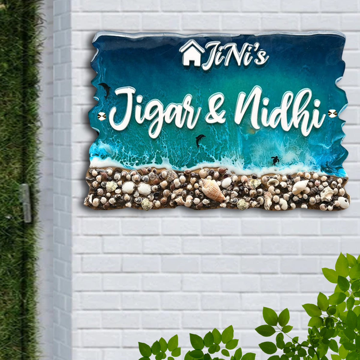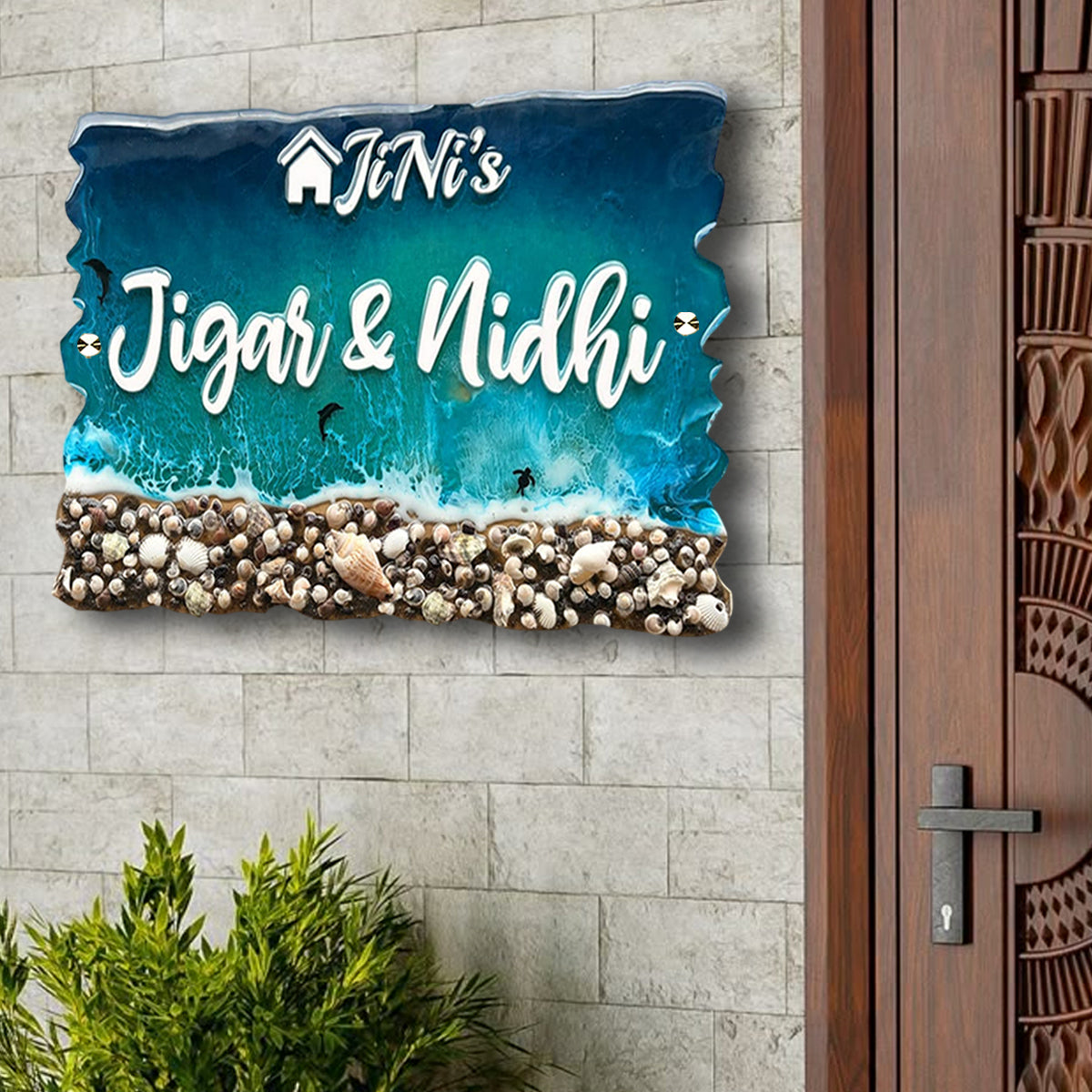 Beach Theme Resin & Acrylic Name Plate for House Entrance, Flat, Bungalow (Shells & Waves)