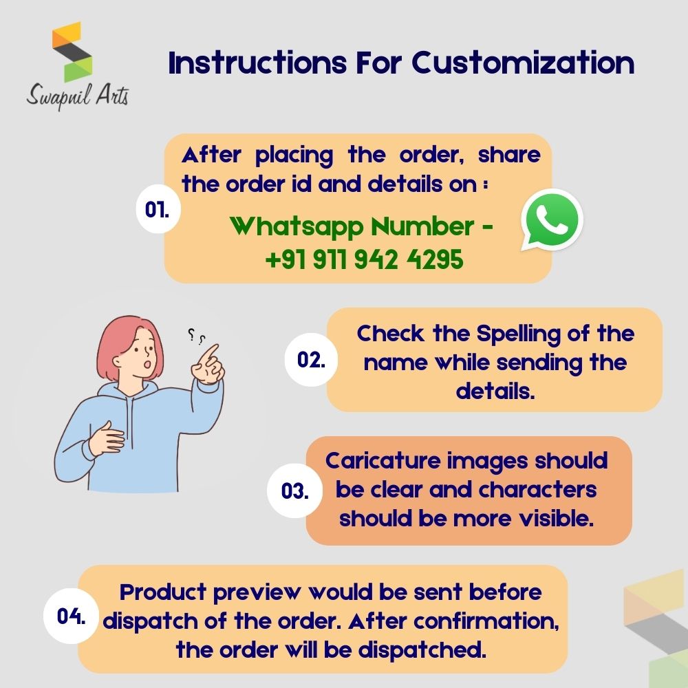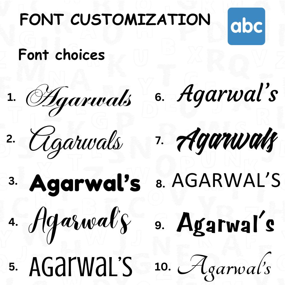 - Customization Process- Share the customization details eg. Names, Icons etc on Whatsapp - +91 9119424295. Choose a font option. We will provide a preview on the Whatsapp or email.