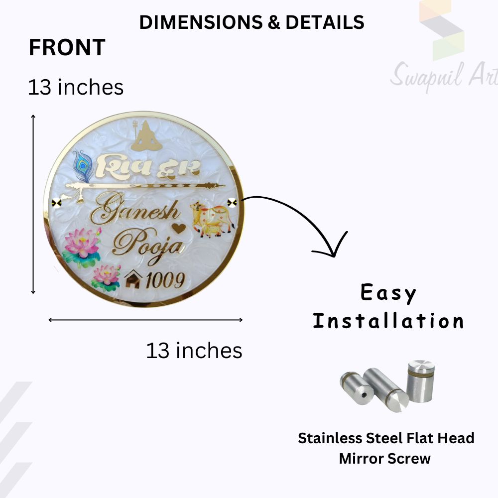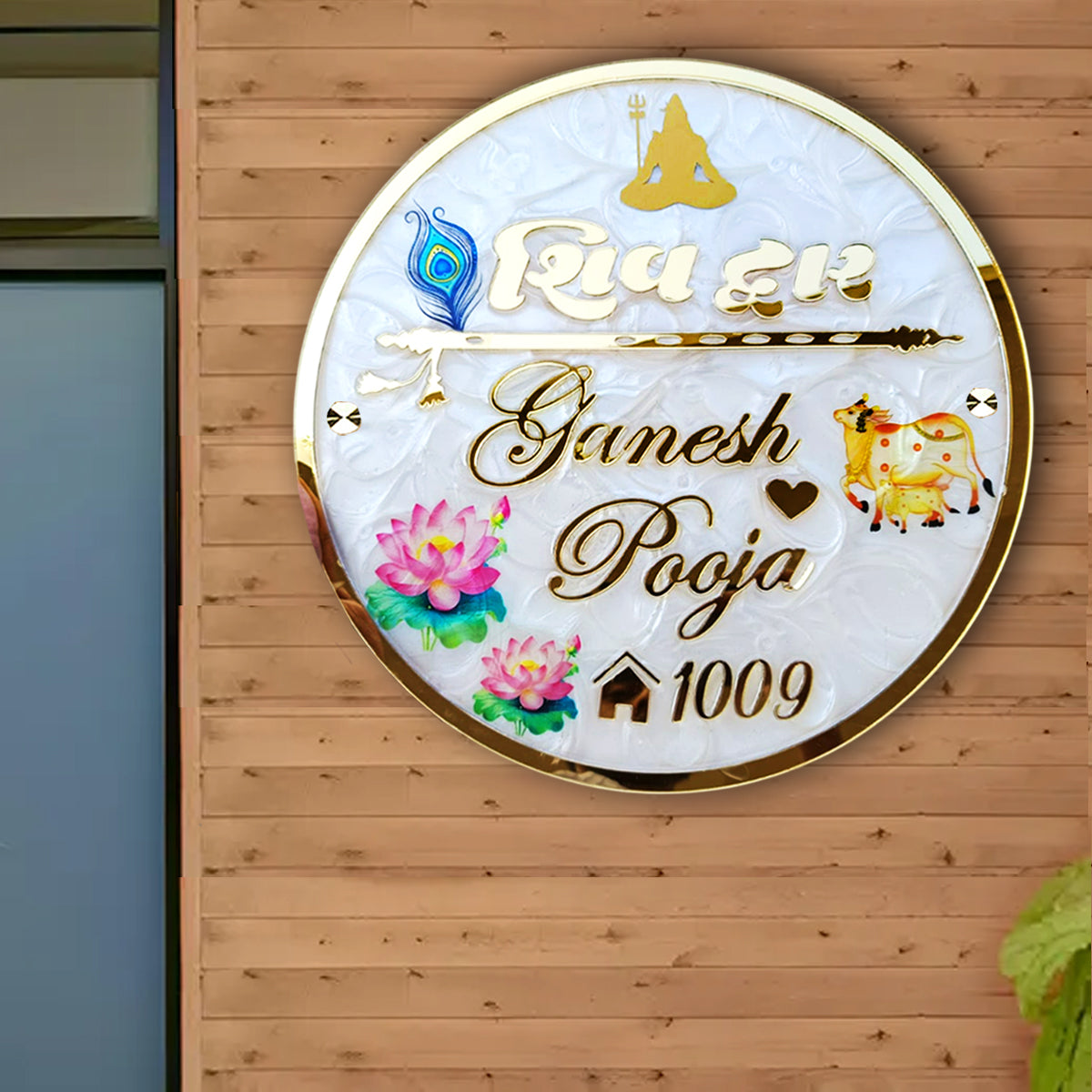 Shiva Theme Resin & Acrylic Name Plate for House Entrance, Flat, Bungalow (Lotus & Cow)